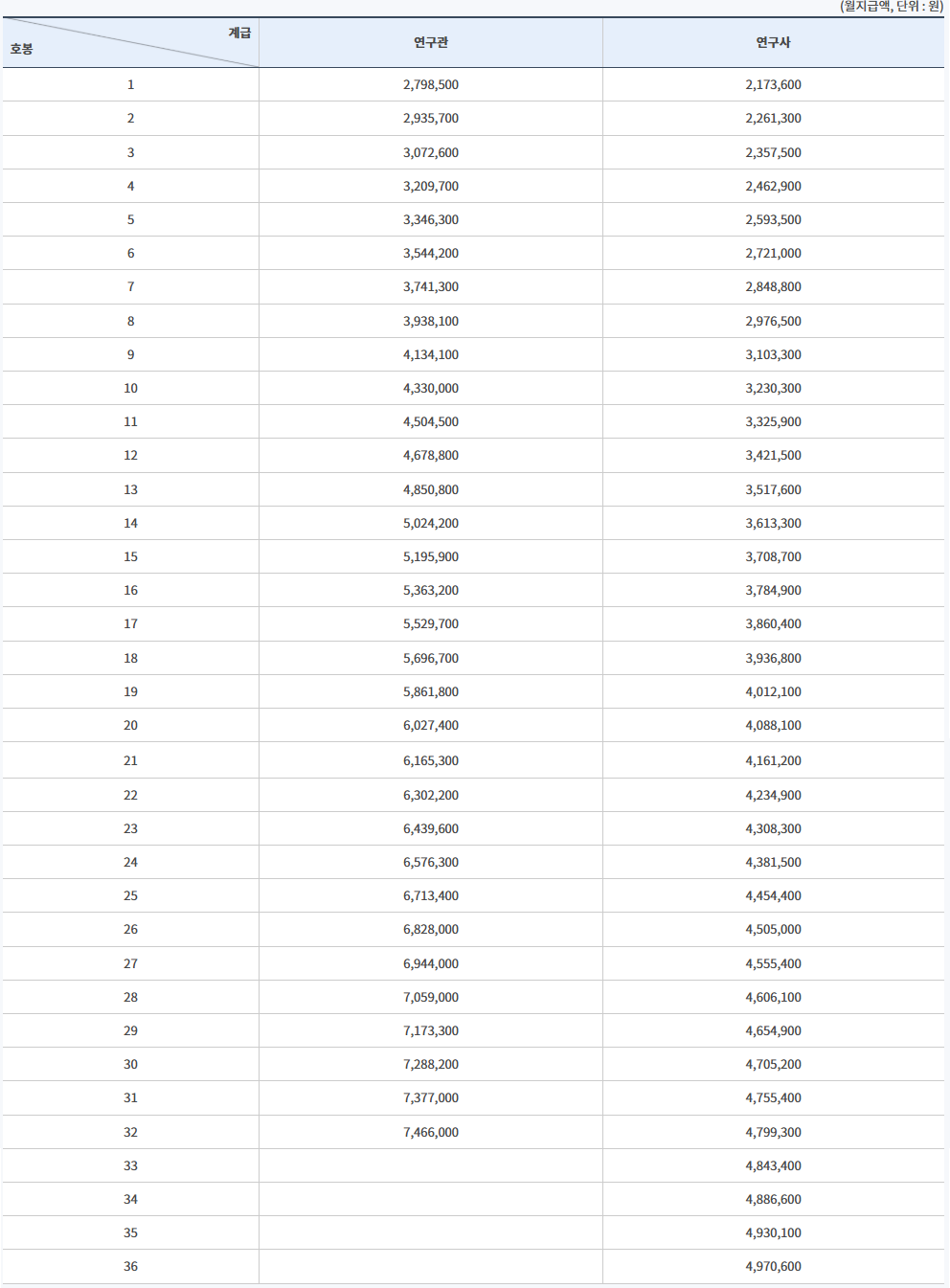 연구직 공무원 및 국가정보원 전문관 봉급표